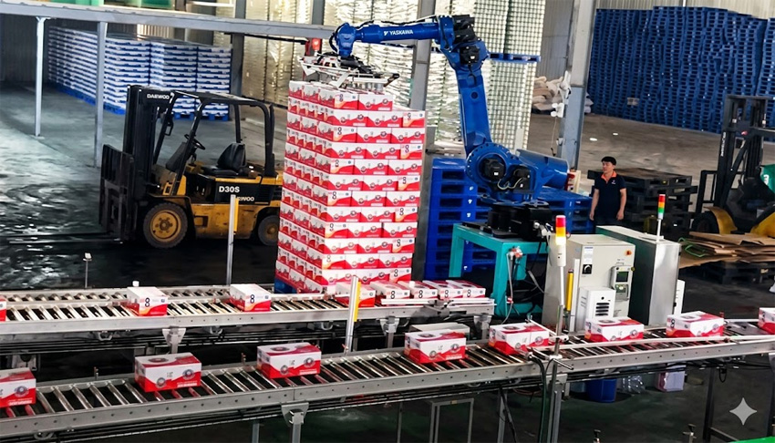 Gắp & Xếp: Robot thực hiện gắp đồng thời 2-4 thùng (tùy cấu hình) và xếp theo layout đã được lập trình sẵn trên pallet.