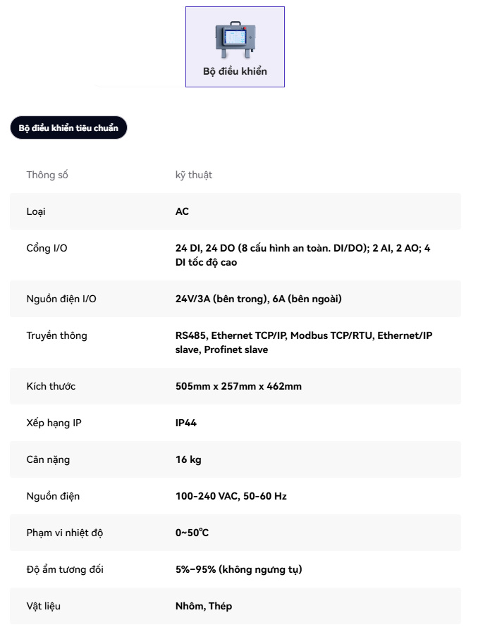 Tốc độ vận hành mạnh mẽ: Đạt tốc độ điển hình 3,3 m/giây, giúp duy trì hiệu suất làm việc cao, giảm thiểu thời gian "chết" trong quy trình sản xuất tự động.
